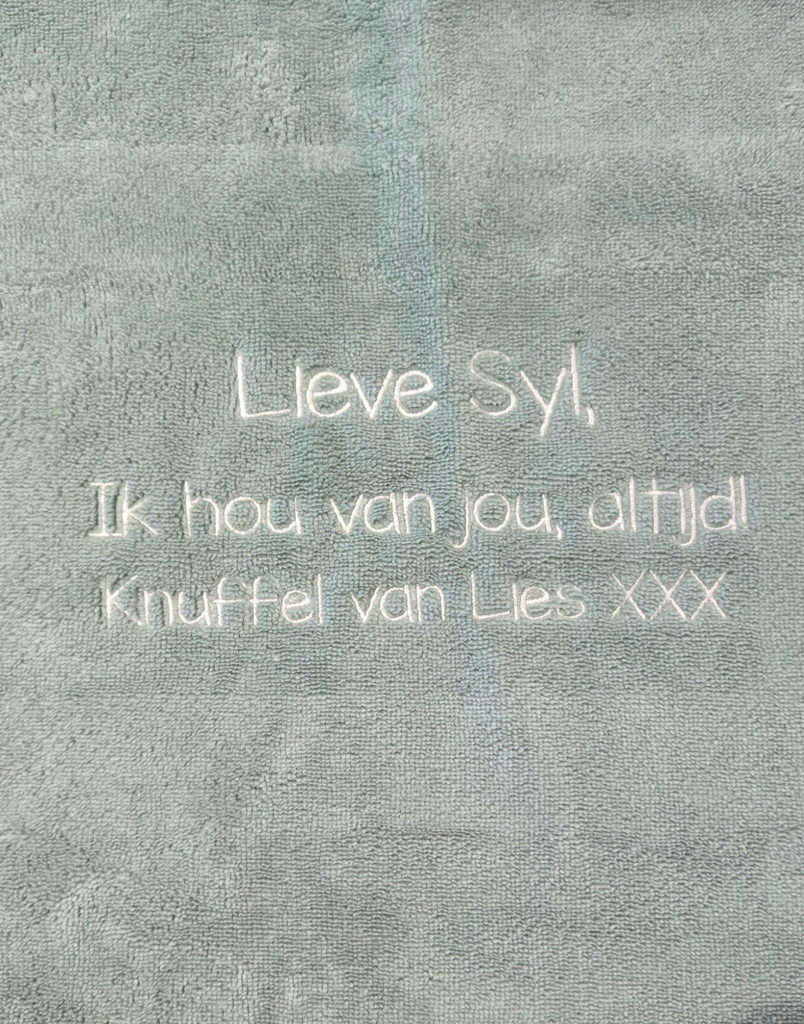 Voor mijn zus met young dementie heb ik dit mooie mintgroene verzwaringskussen van 2 kilo besteld. Ik heb er een wit tekstje voor haar op laten borduren en dit ging heel soepel. Mooie kwaliteit en dank voor de super service, heel fijn dat jullie die stap extra wilden doen voor ons.